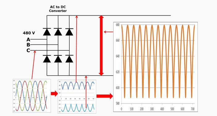 讓我們假設(shè)驅(qū)動(dòng)器在480V電源系統(tǒng)上運(yùn)行。480V額定值為“ rms”或均方根。480V系統(tǒng)上的峰值為679V。如您所見,VFD直流總線的直流電壓帶有交流紋波。電壓大約在580V至680V之間。